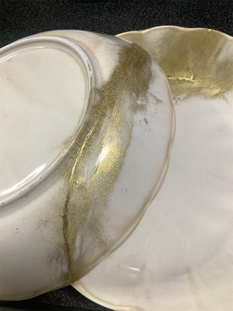 2022-03-05 金継ぎ皿修理6回目(金粉撒き〜金粉固めまで) DIY ハンドメイド メンテナンス 廃プラスチック問題 漆 環境問題 皿の補修 金継ぎ 金継ぎの作業工程も終盤に差し掛かってきました。 今回は、ベンガラ漆の上に真鍮粉を載せました。 撒き餌筆を持っていないのでいつもこんな感じになります。 一応、お皿の真鍮粉は除去しました。 1日乾燥後に、生漆で金固めを行います。 あとは、数日乾燥させて磨きます。